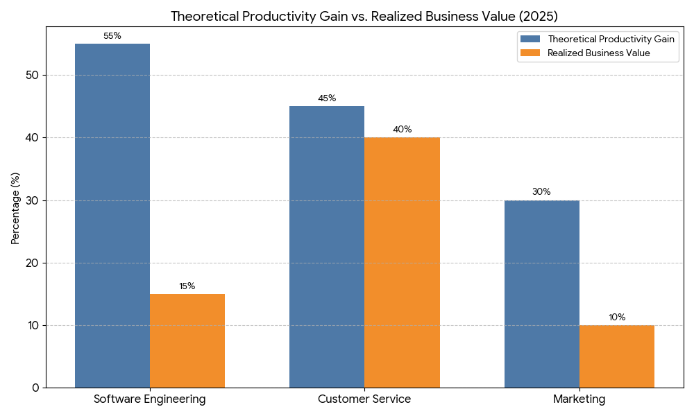 圖表顯示了「轉化落差 (Translation Gap)」現象:雖然軟體工程領域的理論生產力提升最高(55%),但由於流程複雜度與審查需求,實際轉化的商業價值僅 15%。相比之下,客戶服務領域因流程標準化程度高,能將 45% 的效率提升有效轉化為 40% 的實際價值,落差最小。行銷領域則顯示出雖然工具能加速產出,但對最終營收的直接歸因仍具挑戰。