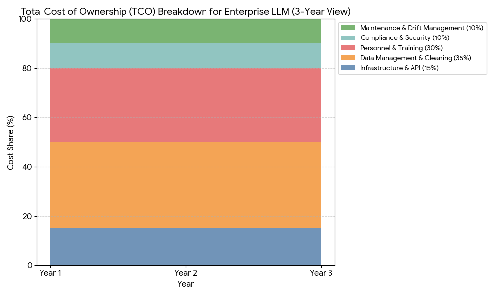 此圖表揭示了企業導入 LLM 的總體擁有成本 (TCO) 真實結構。與一般認知的「API 費用為主」不同,基礎設施與 API 費用僅佔總成本的 15%(最底層藍色區塊)。真正的成本大宗在於「資料管理與清洗」(35%)以及「人員與培訓」(30%),這兩項合計佔據了近三分之二的預算。此外,合規安全與模型漂移維護等隱性成本合計亦達 20%,顯示出 AI 專案的財務負擔主要來自於「讓模型可用」與「讓人會用」,而非模型本身。