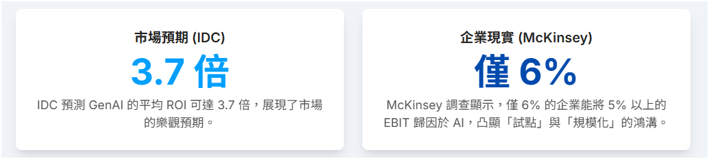 市場上對於 AI 效益的預測眾說紛紜。根據 IDC 2025 年的研究,生成式 AI 的平均 ROI 可達 3.7 倍;然而,McKinsey 的調查卻潑了一盆冷水:僅有約 6% 的企業能將 5% 以上的息稅前利潤 (EBIT) 歸因於 AI。這巨大的落差,反映出「試點專案」與「規模化應用」之間的鴻溝。