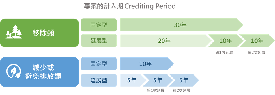 移除型專案和減少或避免排放型專案的計入期(即專案可獲得減量額度的期限)各自有不同的規定與展延機制,移除型專案的計入期較長,而減少或避免排放型專案的計入期較短。