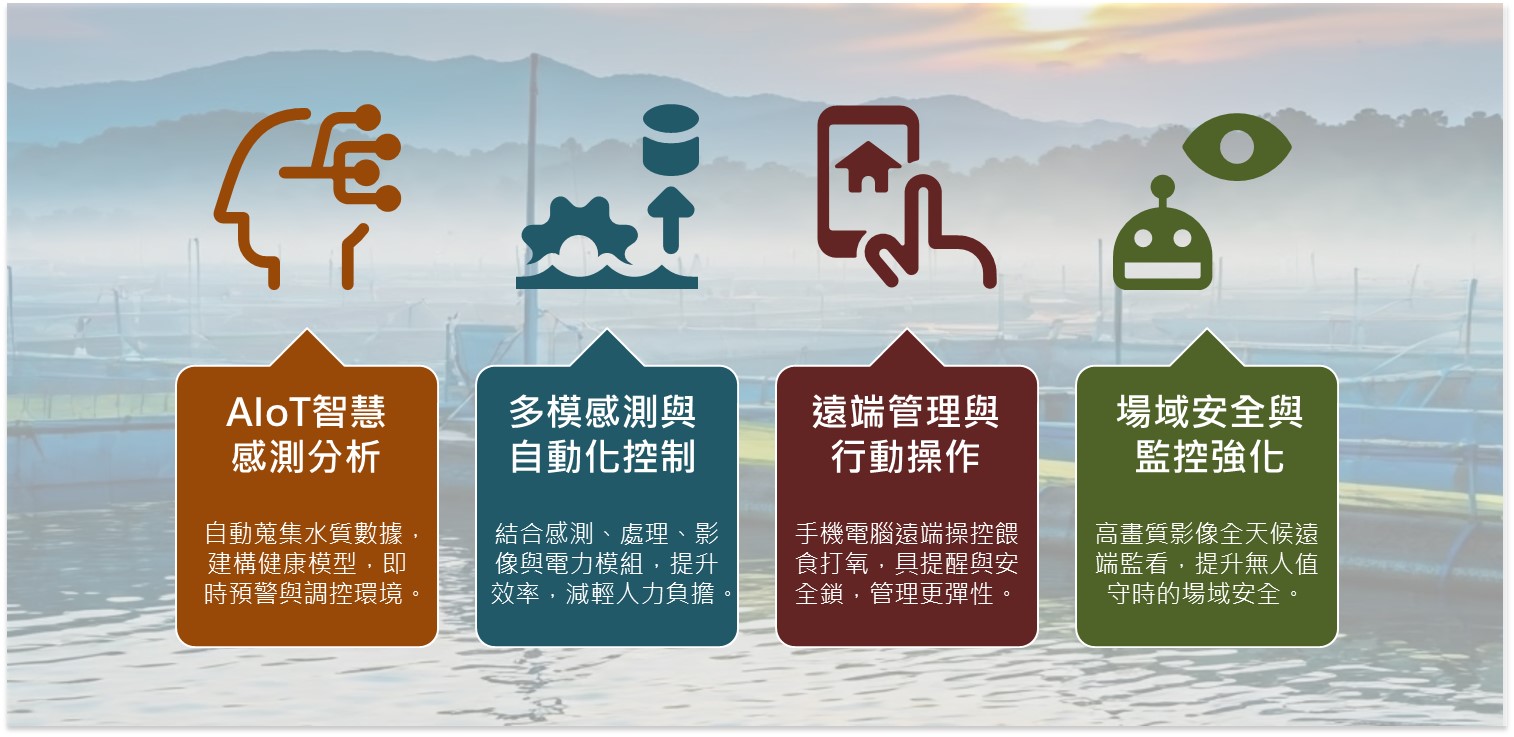 「智慧養殖解決方案」以AIoT與邊緣運算技術為核心,協助養殖業者建立數位化、系統化的水產經營模式,減少人工作業依賴,同時提升管理效率與風險控管能力,具有四大核心功能: