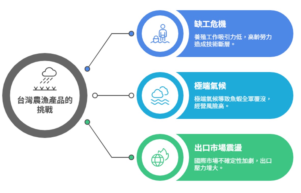 台灣的養殖漁業,在國際上其實頗具競爭力,不論是鰻魚、鱸魚、石斑魚等皆為出口主力。然而,近年台灣農漁產品正面臨三大挑戰: