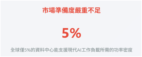 轉型的第一個嚴峻挑戰,來自能源的物理極限。傳統機櫃的功率密度約在15kW左右,但NVIDIA Blackwell架構等新一代AI晶片,已將單機櫃的功耗推升至驚人的100kW,甚至130kW的範疇——這是將近十倍的躍升。然而,全球僅有不到5%的資料中心具備支援單機櫃50kW以上功率的能力(Navitas Semiconductor, 2024)。這意味著,絕大多數現有基礎設施在AI時代面前,已然過時。