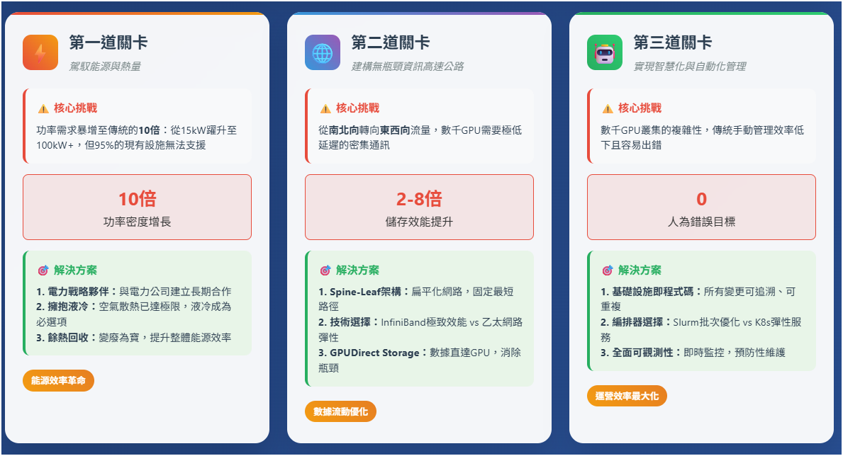 在從傳統資料中心邁向AI工廠的征途上,企業將面臨三道環環相扣的關鍵挑戰。這些挑戰如同層層關卡,任何一道的失守都將導致整體效能的崩潰,讓昂貴的GPU投資淪為閒置資產。以下三張卡片濃縮了轉型的核心要素,每一道關卡都代表著從「成本黑洞」蛻變為「價值引擎」的必經之路。