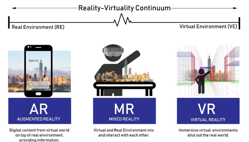 混合實境(MR):結合真實和虛擬世界創造了虛實整合環境和視覺化體驗,並讓實體空間和數位物件共存,並能即時互動。混合實境了現實、擴增實境、增強虛擬和虛擬實境技術,提供半沉浸於虛擬世界的體驗,使用者可以與虛擬物件進行高度互動,透過手部或身體動作操控、碰觸虛擬物件。