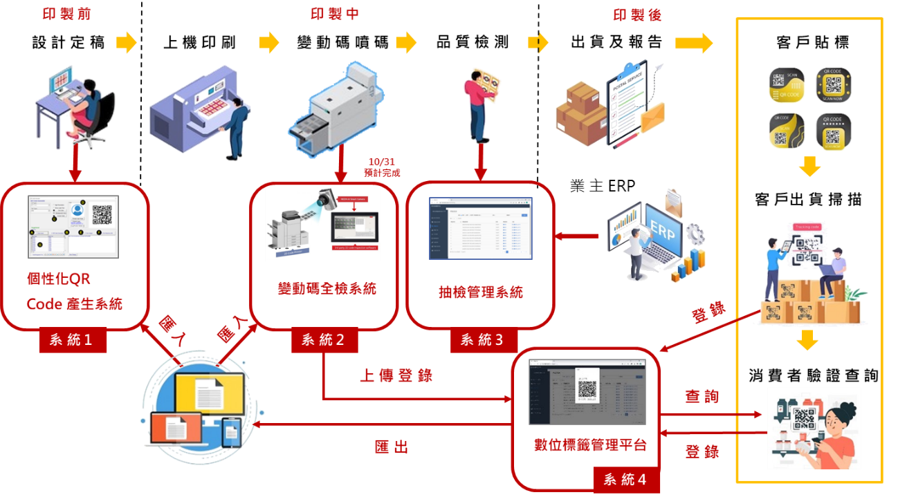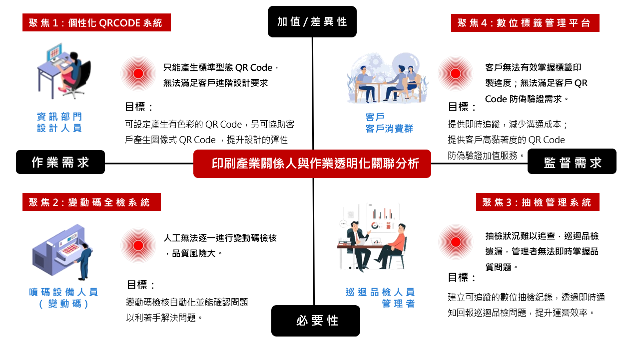 運用資策會資通訊專業技術與採用服務設計方法論引領印刷產業智慧升級轉型,效益提升,以服務設計思維開發數位標籤追蹤服務方案至印刷場域,助力30多年有價證卷及防偽印刷品牌業者,掌握數位變動條碼印製及檢核管理等需求痛點,輔導導入個性化QR Code設計及數位標籤管理檢核系統,全面提升變動碼標籤印製生產流程,可自動化生產管理及做到印刷品全檢核服務品質升級。