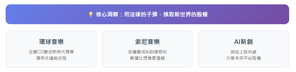 音樂界打得最火熱。那些你熟悉的大唱片公司,像環球、索尼,一開始氣沖沖地要告死AI公司,但現在他們學聰明了。他們的新策略是:【用法律的子彈,換取新世界的股權。】