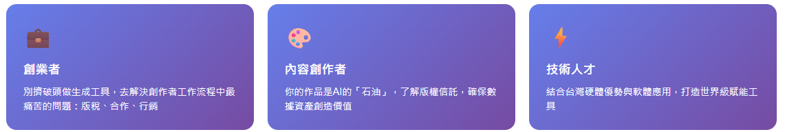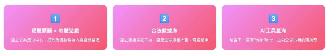 AIGC非常耗算力,白話講就是非常吃電、吃伺服器。這正是台灣的強項。我們的半導體和硬體實力是世界頂尖的(這就是「矽盾」)。我們應該把這個優勢,用來支持內容產業。由政府帶頭,整合資源,弄一個專門給文化內容產業用的「公共算力中心」,讓新創公司和創作者,可以用便宜的價格,用到頂級的運算資源。這就是把硬實力,變成軟實力的基礎。