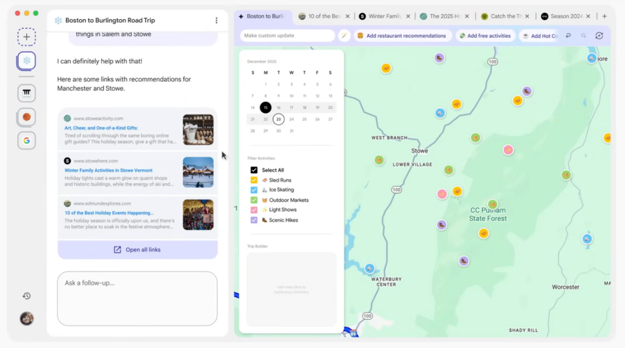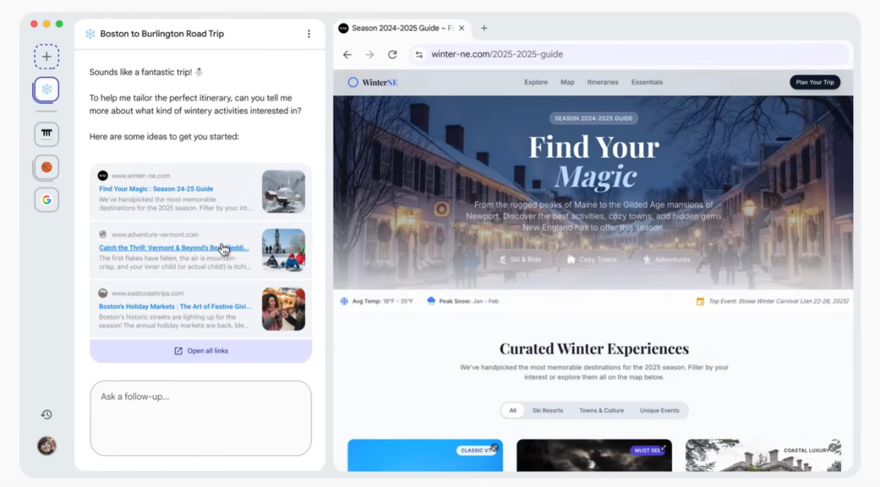 Disco的操作始於一個使用者所熟悉的動作:在聊天框中輸入需求。這部分算是承接了過往瀏覽器一貫的驅動機制,然而,接下來他即將推出的體驗將與現今所有的瀏覽器或聊天機器人有截然不同的感受,以下將詳列其更動及服務內容與特色: