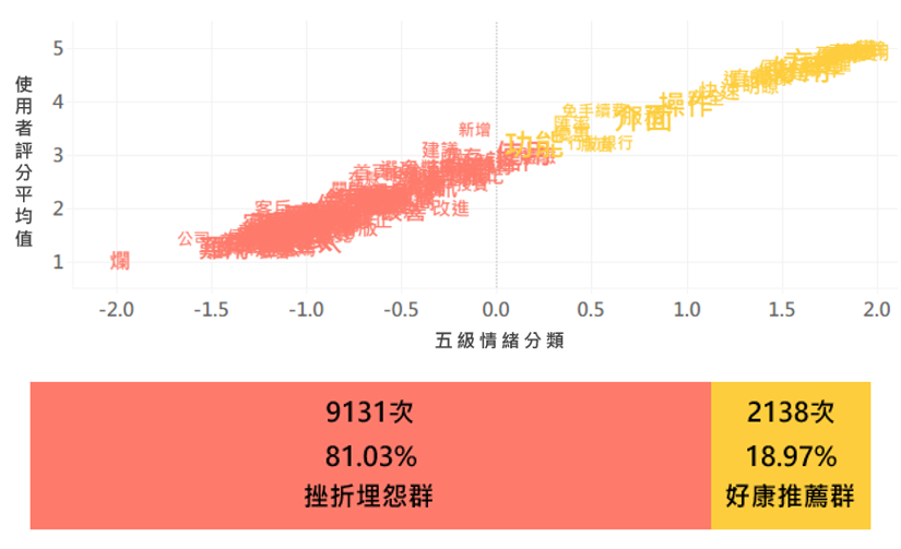 分析結果顯示,多數使用者傾向認為,行動銀行系統的順暢運作是理所當然應具備的能力,當遭遇無法登入、閃退、語系轉換等干擾因素無法即時使用服務時,使用者就會被強烈挫折感推動而留下負評。但在系統運作正常時,卻僅有少量民眾會主動留下好評,回應行動銀行APP對自己的改善與幫助。因此部分銀行才會以制定規範或其他活動措施,促使使用者行動並留下正面評價。須特別留意的是,Apple在其法律與開發者條款中皆提到,不允許以任何方式操縱評分或評論,例如提供或接受任何形式的補償或獎勵,否則該APP或開發商可能需要面臨被下架的風險。