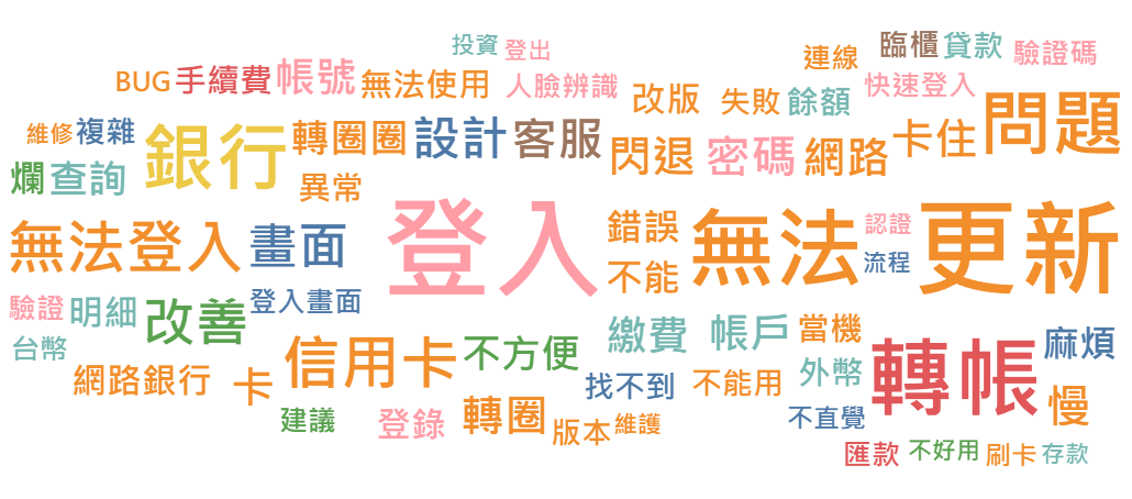 挫折埋怨族(左下紅色集群):特徵為負評與強烈負面情緒,排名前三多的關鍵字分別是登入(提及982次,佔本群關鍵字總數10.8%)、更新(894次,9.8%)、無法(606次,6.7%),佔本群所有評論近三分之一。這些關鍵字通常是伴隨出現,可見多數使用挫折常與軟體更新後無法登入相關,並傾向將本次挫敗經驗與過往使用其他銀行APP的良好經驗做比較,部分問題即便聯繫客服或臨櫃也無法獲得解決,建議可將登入相關功能的穩定性,作為軟體發布更新前優先進行系統檢測與服務改善的主要項目。