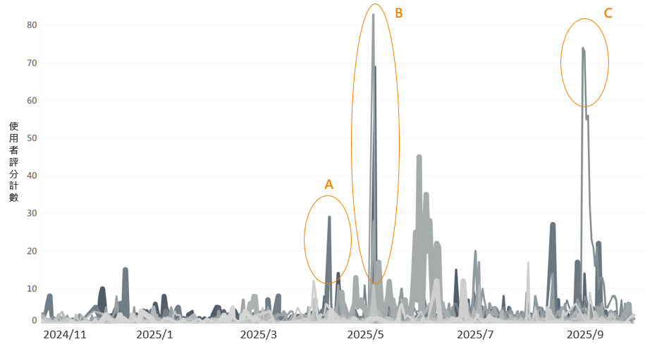 若進一步以評論日期(年月日),分析近一年內高分評價與低分評價的發生時間點,可觀察到近一年內的負評高峰有以下三處。
