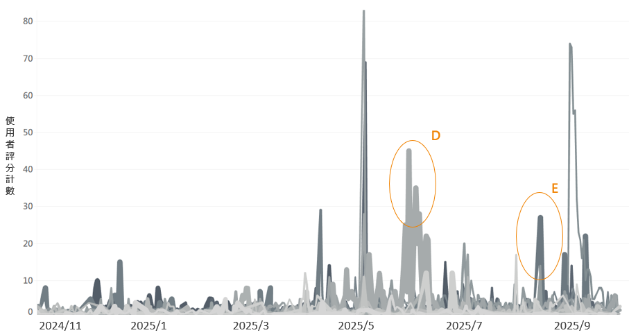 反觀近一年的高分評價高峰,僅有D與E兩處,且評論人數遠遠不及負面評論。對照D與E的評論原文與關鍵字,發現此兩高峰可能有配合行銷活動或進行使用者評價邀約,整體評論內文偏短而用詞重複度高。