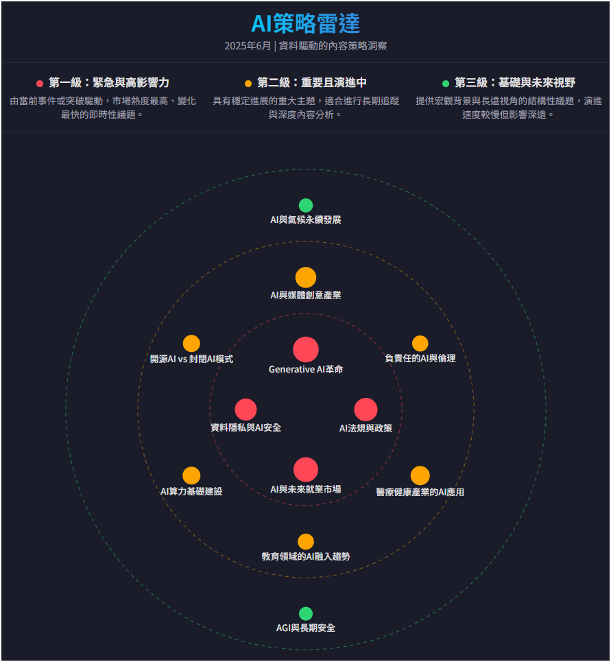 附註:本「AI Adoption Issue Radar」報告由 ChatGPT 4.5 搭配 Gemini 2.5 Pro 模型生成。其內容與議題排序,是透過綜合分析大量公開數據和權威資訊所得。其彙整了來自全球頂尖研究機構、國際知名媒體、官方政策檔案及專業學術報告的資料。透過關鍵字頻率、新聞報導量、報告發布密度等指標,評估各議題的熱度、影響力與時效性。