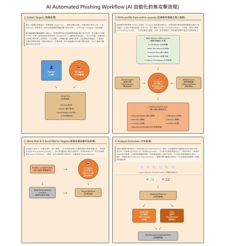 這張圖展示了現代 AI 詐騙的「全自動生產線」。從左上角的「蒐集目標」開始,AI 就像一個不知疲倦的員工,自動肉搜你的個資、分析你的弱點、寫出客製化的詐騙信,最後還會根據你的反應「自我進化」,變得越來越聰明。