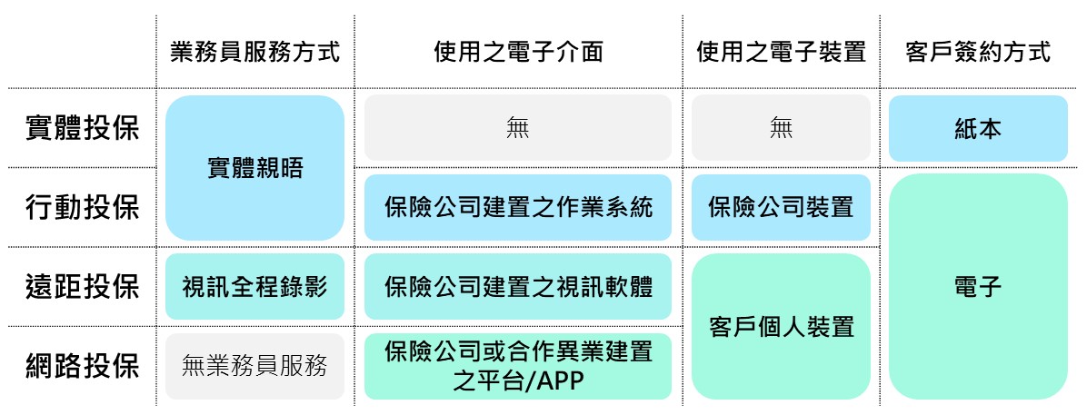 其次於2015年開放「行動投保」,仍然需要業務員親自與客戶接觸,但取消紙本作業,改用保險公司提供的平板或手機等行動裝置,由業務員協助客戶投保,須遵循法規為「保險業經營行動服務自律規範」。