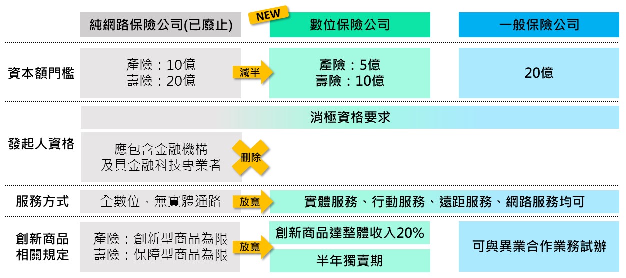 本次修正在資本額、發起人資格、服務方式及創新商品比例等方面大幅放寬。除資本額門檻砍半,更刪除發起人積極資格、不再要求應有金融機構及具金融科技專業者。服務模式方面,考量保險實務運作難以完全以網路為之,不再限制僅能透過網路服務客戶。商品方面,創新型商品比例降低至20%,且提供半年之獨家販售權,其他業者於此期間不得販賣相同商品,保障先行者創意。