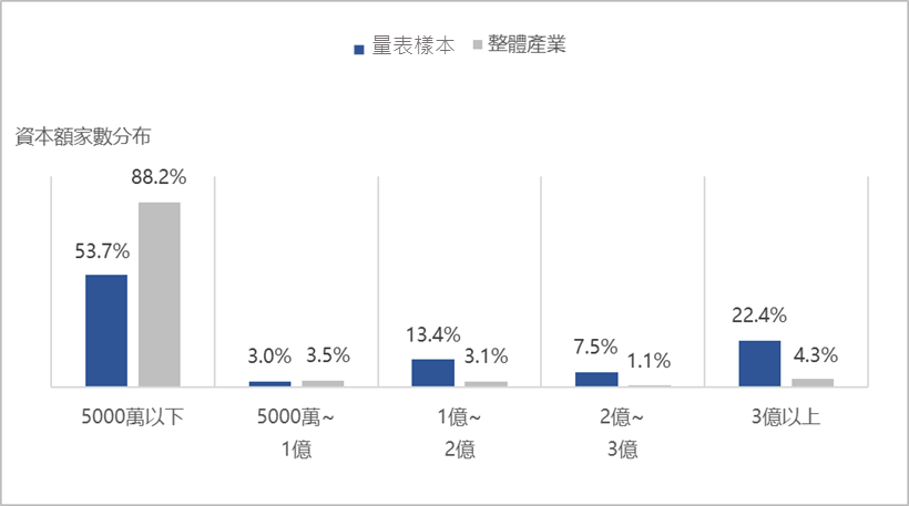 本次調查量表樣本與產業整體資本額組成如圖1,可發現量表樣本的資本規模偏大,更集中在資本額1億元以上之企業,反映出大型企業對數位化議題較有興趣、填寫意願較高。
