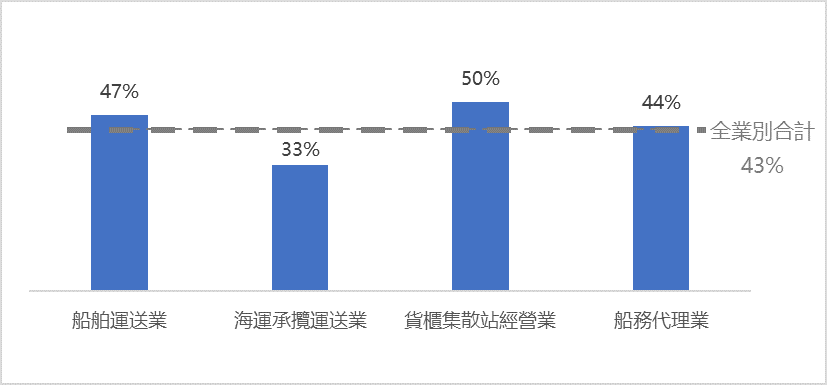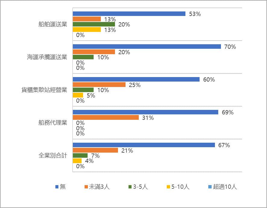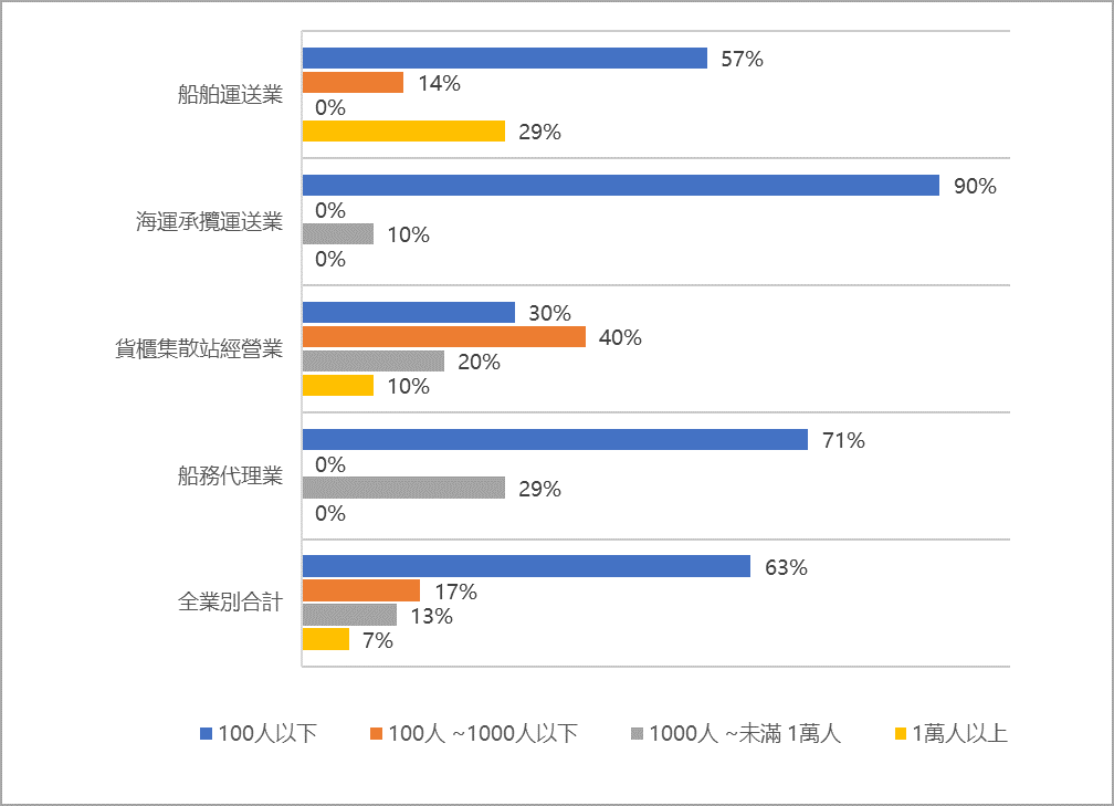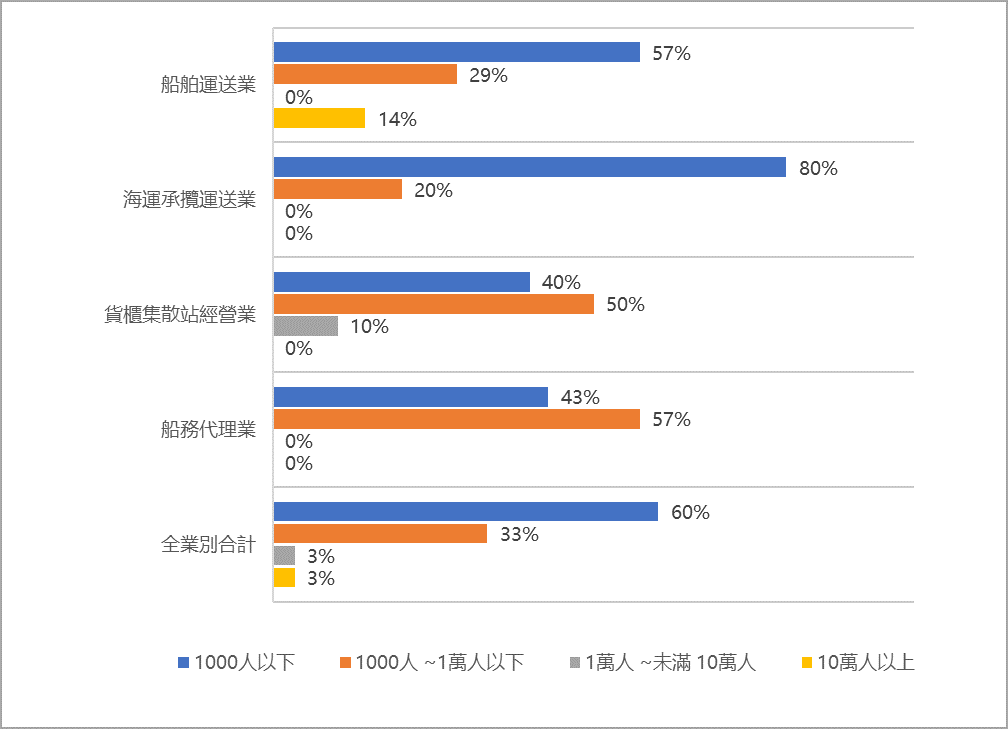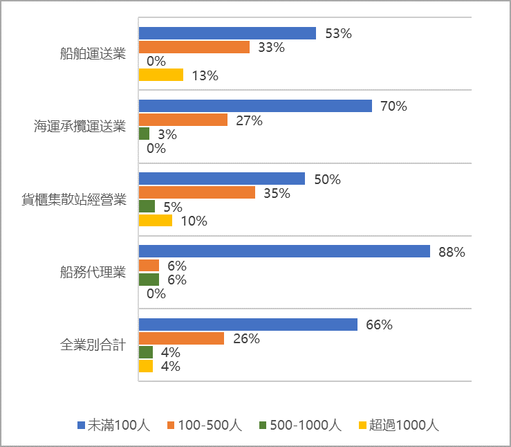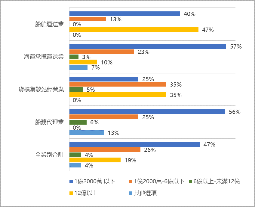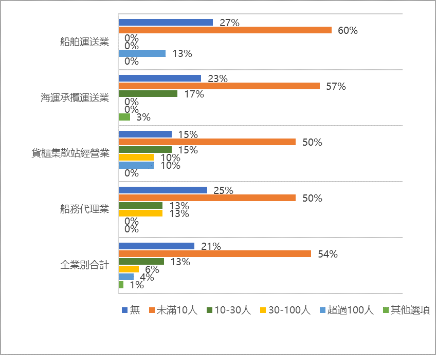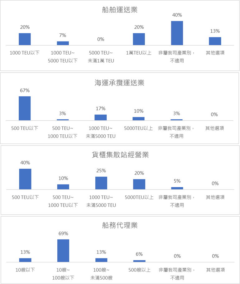 透過以上資訊,可對四大業別的基本狀況有初步了解。簡言之,本次調查企業中,船舶運送業與貨櫃集散站經營業有著類似的特性,而海運承攬運送業與船務代理業就較相似。其中,船舶運送業與貨櫃集散站經營業的員工及營收規模偏大,有10%以上企業的員工超過1,000人,40%以上企業的營收超過6億;反觀海運承攬運送業與船務代理業,所有企業的員工人數皆在1,000人以下,營收超過6億元的企業比例約10%,比例不及船舶運送業與貨櫃集散站經營業的一半。