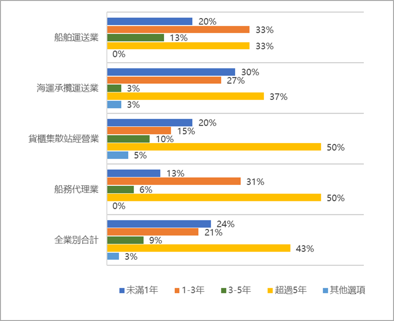 至於企業投入的數位轉型旅程的時間(圖4),貨櫃集散經營業和船務代理業的數位化經驗最突出,50%以上企業的經驗超過5年。由此可發現,船務代理業雖然員工、營收方面的營運規模較小,卻相當關注數位化,從其商業模式來考量,船務代理業的業務多元瑣碎、競爭激烈,可能正是營收不易擴大,人力成本相對重要,利用數位化來提升效率及服務品質正是重要策略。