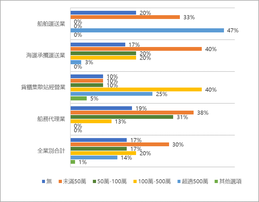 本次量表調查中,船舶運送業和貨櫃集散經營業出現較高比例的企業,具有較大的員工及營收規模。依圖2及圖3所示,兩業別各有10%以上企業之員工超過1,000人,35%以上企業之年營收超過12億元。相較之下,海運承攬業和船務代理業的員工人數都小於1,000人,海運承攬業有10%達到12億元年營收,船務代理業的年營收則皆未達12億元,比例上都遠低於船舶運送業和貨櫃集散經營業。