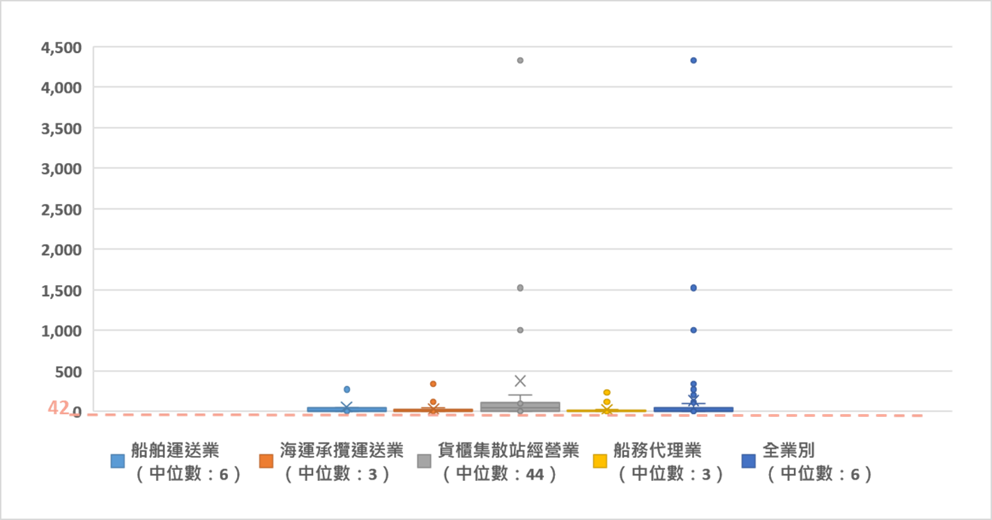 船舶運送業需要極大資本投入,且需營運全球的航點,企業規模偏大並不意外;而貨櫃集散站經營業方面,經細部查看,大規模的企業多為跨業別,如航運母公司經營的貨櫃集散站,影響其員工及營收規模特別突出。