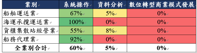 在數位平台的經營上,整體調查企業有43%建置了數位平台,比例不到一半,顯示數位平台的利用還不算普及,其中又以海運承攬業最低,僅33%企業有數位平台,是唯一低於平均水準的業別。