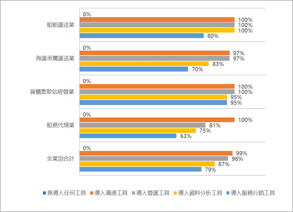 相對而言,企業對數位工具的導入倒是非常踴躍(圖9)。若將數位工具分為溝通、營運管理、資料分析、服務行銷共四類,所有企業都至少有使用其中之一,其中又以溝通和營運工具最為基本,95%以上的調查企業都有使用,而服務行銷工具的導入比例雖然最少,但也近8成,可見這些數位工具的使用已十分普遍。船舶運送業的導入工具最為廣泛,每家企業都已導入溝通、營運管理、資料分析工具,在工具運用上的接受度最高 其次為貨櫃集散站經營業,每家企業皆導入了溝通、營運管理工具,資料分析及服務行銷工具亦有95%的企業在使用。