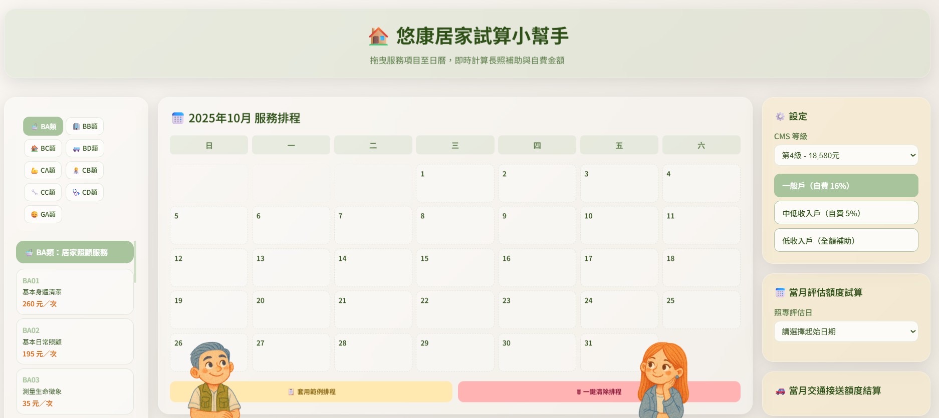 其核心功能之一為「比例分攤計算」:當照顧專員首次核定照顧額度時,系統會依評估當日自動按比例分配當月可用額度,例如第四級額度為18,580元,若於10月10日評估,則本月僅可使用13,178元,至次月起方可使用完整額度。此設計符合政策規範,能有效避免家庭誤解補助金額,並協助督導與家屬即時比較與調整方案,提升家庭財務規劃彈性與居家服務營運效率。