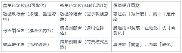 - 對人才培育:顧問公司應放棄尋找純粹的數據專家,轉而培養 「人機協作專家」。這類人才需具備「提問、驗證、轉譯」的能力。