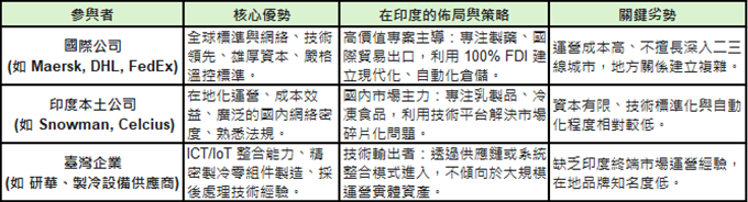 印度冷鏈市場的競爭格局由三大群體構成:A. 資金雄厚的國際公司(註4)、B. 熟悉在地運營的印度本土公司(註5),並加入C. 具備供應鏈技術優勢的臺灣企業。