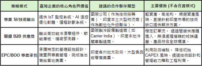 對於臺灣企業而言,面對這個充滿機會的市場,「輕資產、高技術輸出」是最佳策略。我國廠商應避免採用複雜且高風險的股權合資模式 (JV),轉而聚焦於臺灣的核心競爭優勢——即 ICT/IoT 智慧技術和精密製冷的關鍵零組件輸出。