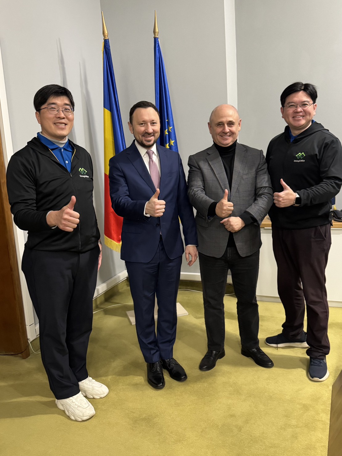 圖2:雄材大智與羅馬尼亞相關政府部會會面並與當地合作夥伴簽定MOU。雄材大智林正雄總經理(左1)、羅馬尼亞環境、水資源與森林部部長Mr. Mircea Fechet(左2)、羅馬尼亞Green Group總裁Mr. Constantin Damov(右2)、雄材大智莊智翔策略長(右1)。