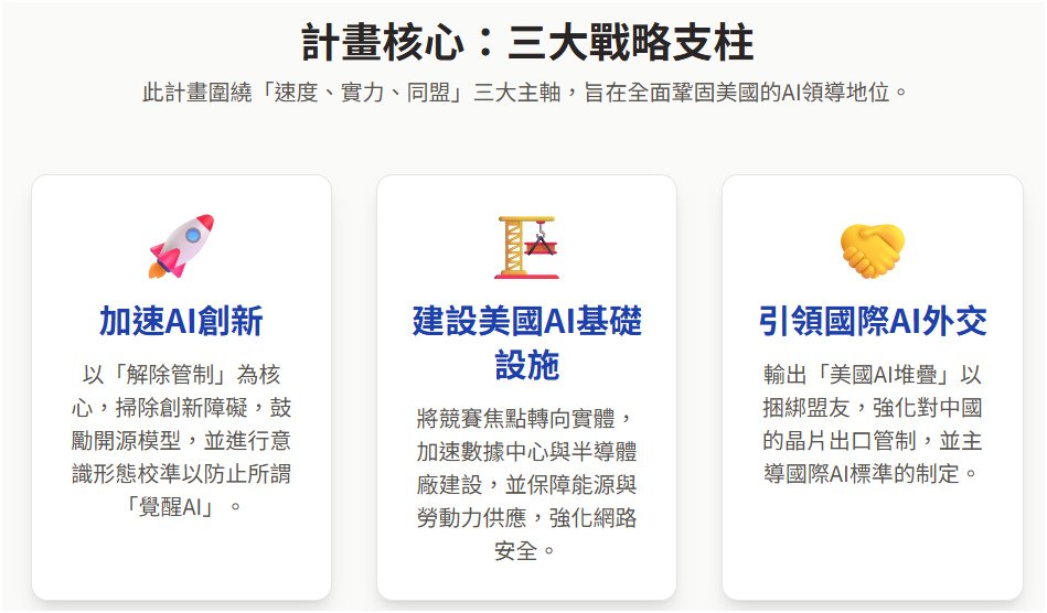 首先,我們需要理解美國官方提出的計畫框架。整份行動計畫圍繞三大核心支柱展開,旨在從創新速度、基礎實力及國際同盟三個維度全面鞏固其領導地位。