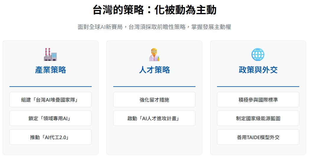 綜合前述分析,美國的AI行動計畫為台灣帶來了清晰的雙重影響:我們既是實現其藍圖不可或缺的「核心製造基地」,迎來龐大商機;同時也面臨著產業結構過度集中、能源需求劇增,以及核心人才外流等三大結構性壓力。