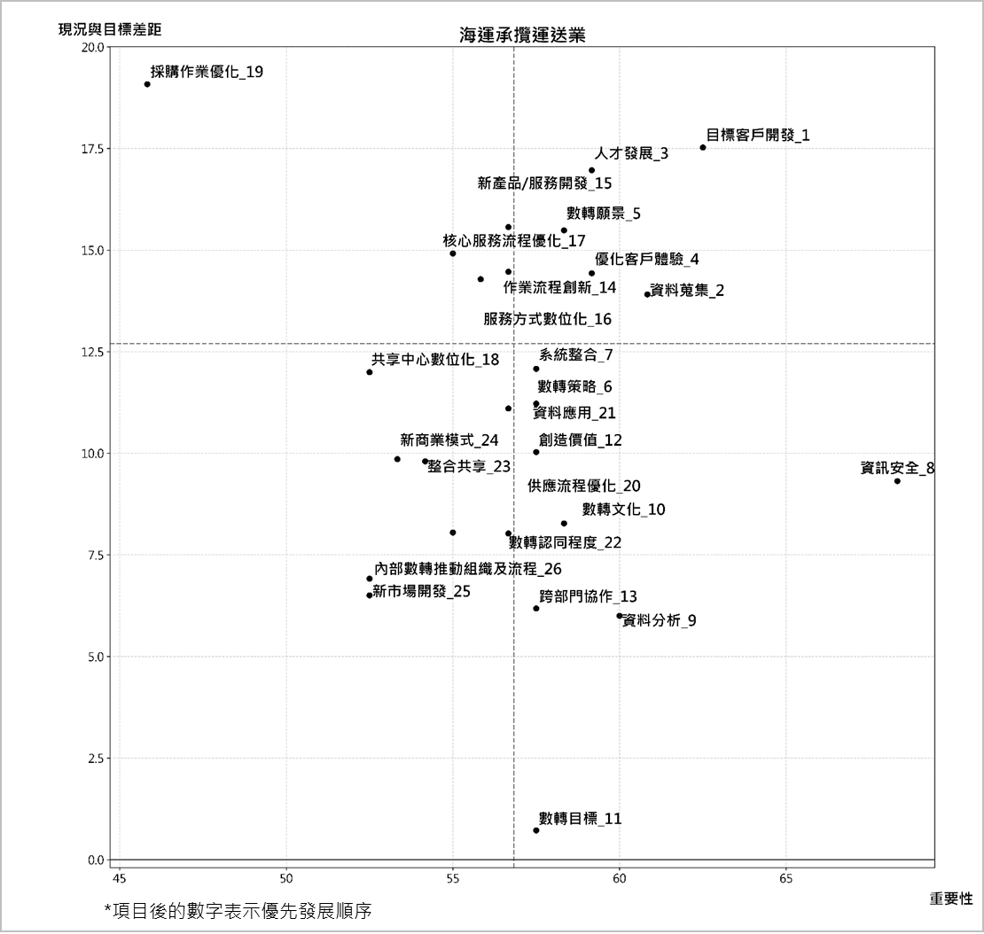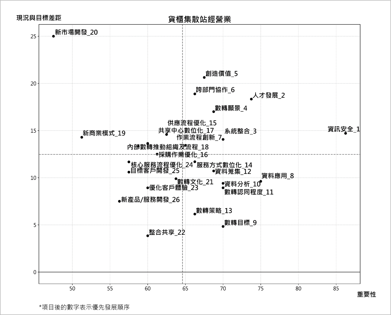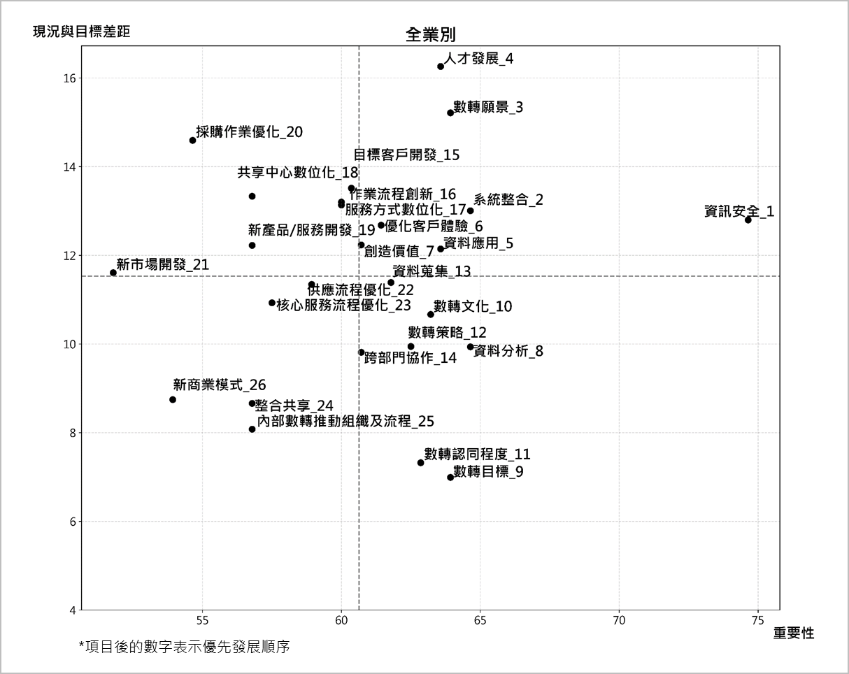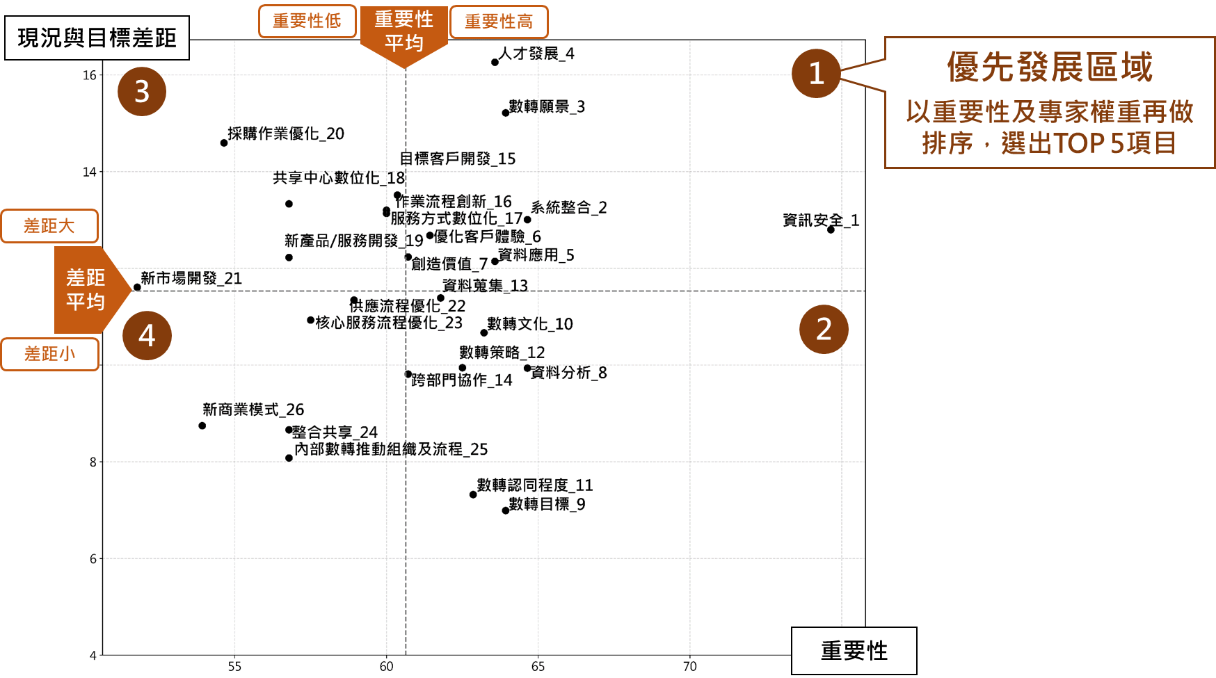 (一) 26個數位化項目依其現況與目標差距、重要性,以差距平均、重要性平均為界,先分成4類,示意如圖1。圖中的標號即為選擇順序,當中重要性高且差距大的項目,為優先發展區域。