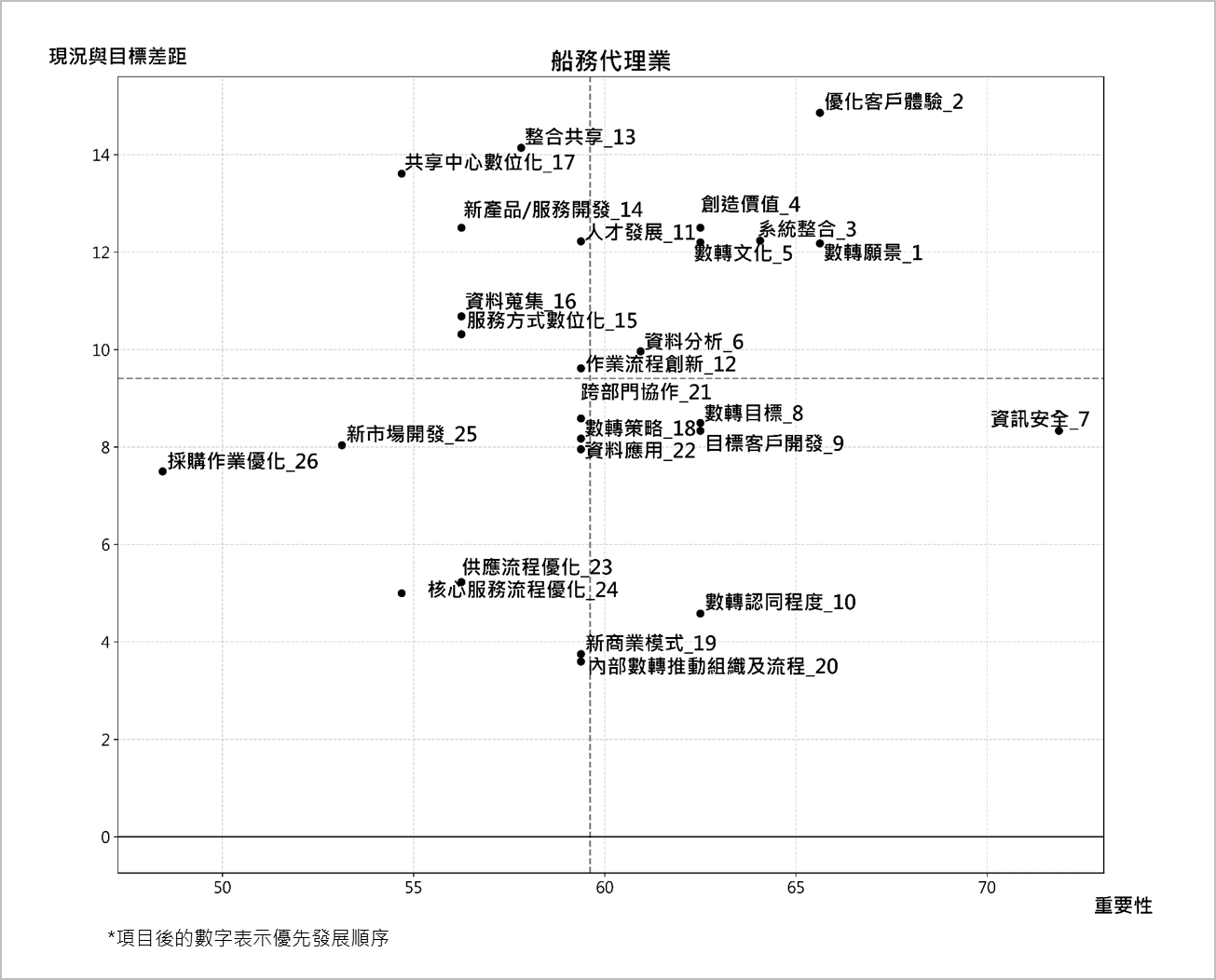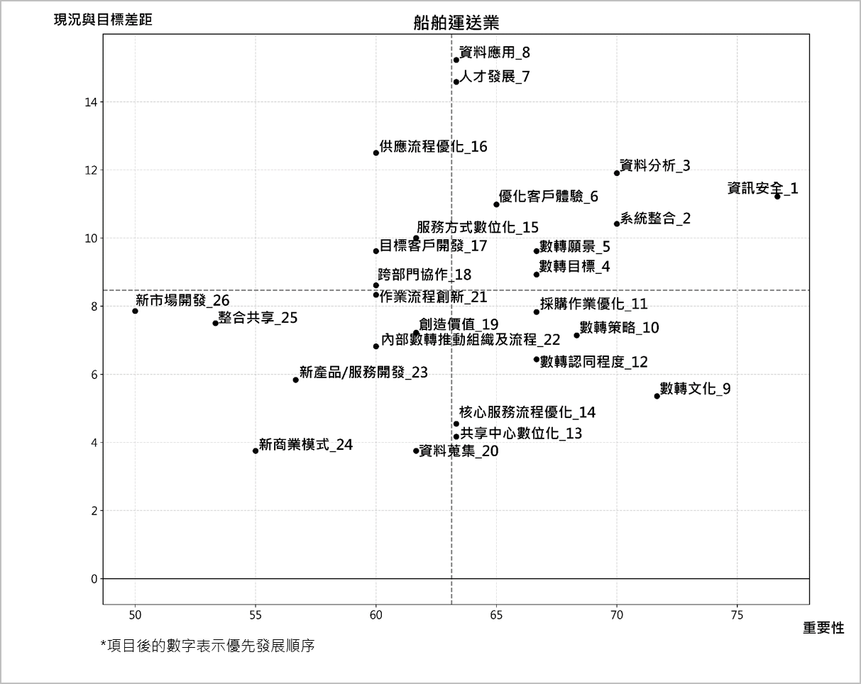 關於船舶運送業,建議優先項目依序為資訊安全、系統整合、資料分析、數轉目標、數轉願景(圖3)。船舶運送業的優先項目偏重於兩大層面,一方面是資料驅動,系統整合其實也可視為促進資料分析的基礎建設;另一方面,則是內部願景及目標的塑造,強化數位轉型的戰略擬定及組織共識。
