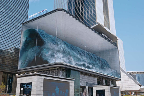 隨著這項技術在美國嶄露頭角,裸視3D浪潮不僅席捲美國,也遍及亞洲各大城市。其中,韓國多媒體設計公司d’strict於首爾COEX Artium大樓外牆,打造大型數位藝術裝置《WAVE》,便是亞洲地區極具代表性的作品。該作品利用寬80公尺、高20公尺的曲面LED螢幕,結合裸視3D與變形錯視技術,呈現出逼真翻湧的海浪影像,搭配擬真的海浪音效,營造出彷彿整座城市即將被巨浪吞沒的震撼場景。d’strict期望透過這股磅礡的視覺海浪,為城市民眾帶來情緒上的釋放,同時展現自然力量的視覺美學。