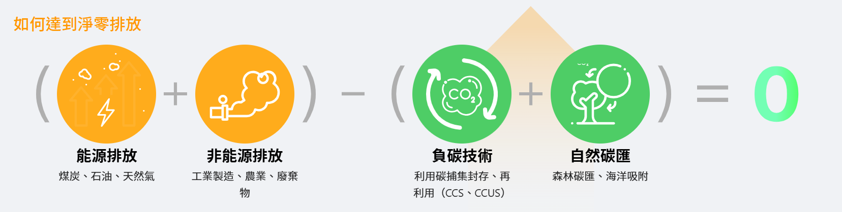 淨零碳排(Net Zero Emissions)所指的是在特定一段時間內,由人為所排放的溫室氣體量和人為移除的量相互抵銷後,使其最終結果為零。因此,淨零並不代表不排放溫室氣體,而是盡量的減少人為所造成的溫室氣體排放,並透過各式管道如,再生能源發展、能源轉型、廢棄物循環再利用等作為來抵銷碳排放量,而難以抵銷的部份,就以負碳技術、自然碳匯等方式進行。