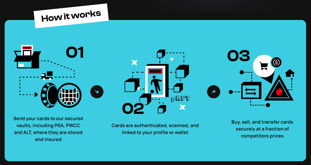 gacha.collectorcrypt.com是一個結合RWA(真實世界資產)的NFT交易平台,官方從世界各地的管道(例如eBay等)搜集卡牌,並交送卡牌鑑定機構PSA(Professional Sports Authenticator)檢驗。PSA為各種卡牌進行真偽鑑定和品質評分,並會給予一個等級分數(例如PSA 10代表卡牌幾乎完美無損)。卡牌實體會存放在Collector的保險庫,並將其以NFT的形式上鏈至 Solana。當NFT被交易時,新的持有者可以選擇繼續持有、轉賣,或憑NFT向Collector贖回實體卡牌。
