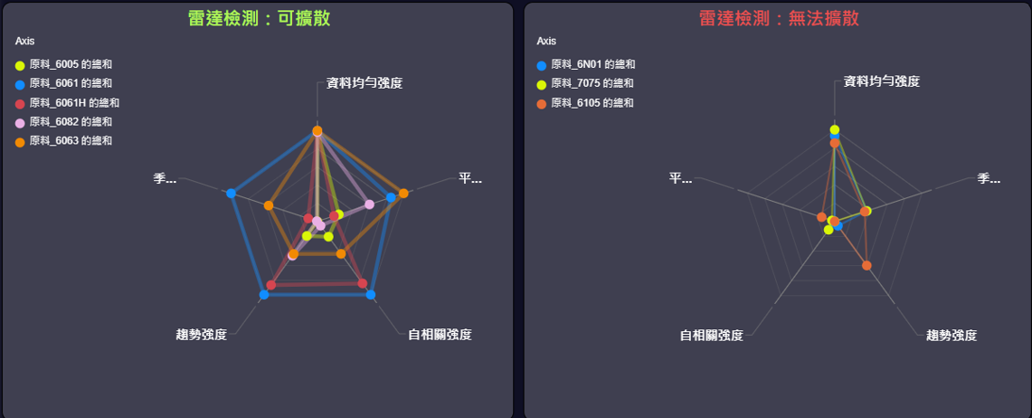 原料時序資料診斷,透過資料分群與特徵擴散可視化,有效辨識原料的穩定性、變異性與預測趨勢,自動篩選具預測價值的原料,減少80%建模時間與50%運算資源投入,協助企業聚焦關鍵物料,提高預測效率與決策精準度。