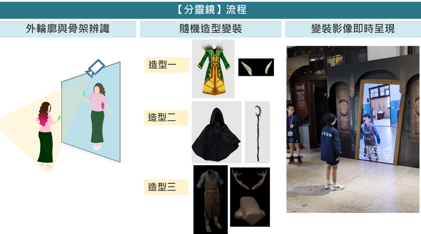 以體驗設計賦能傳統活動內涵,導入人體外輪廓AI識別與骨架動作分析技術、臉部AI識別技術,結合活動特色元素(如:神仙、精靈…等),以生動有趣的AR濾鏡讓民眾立即融入活動情境,創造獨特的互動體驗,並可帶走專屬影像,為參與活動留下紀念藝術品,可應用於藝文展演、台灣燈會、媽祖遶境、實境解謎等文化活動。