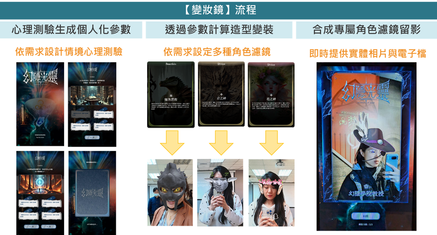 結合心理測驗機制,透過數據運算推薦AR裝扮,並運用臉部AI識別技術精準捕捉五官輪廓,即時套用虛擬妝容與裝飾;體驗完畢提供專屬影像電子照片下載及實體列印留念。