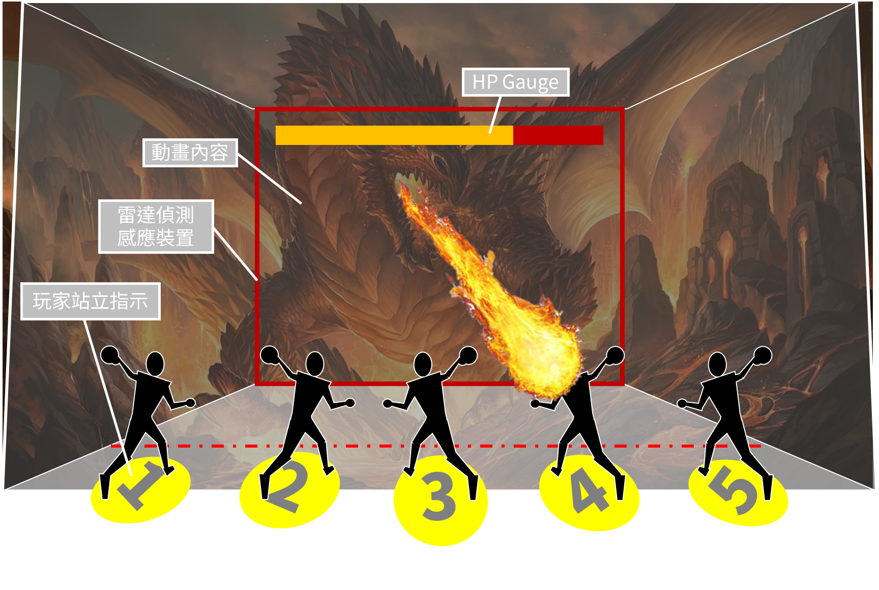 運用4K攝影機可同時AI辨識6人肢體動作,並使用光學雷達偵測球體碰撞點,讓玩家不需配戴任何裝置即可融入遊戲情境,達到互動攻擊的效果。