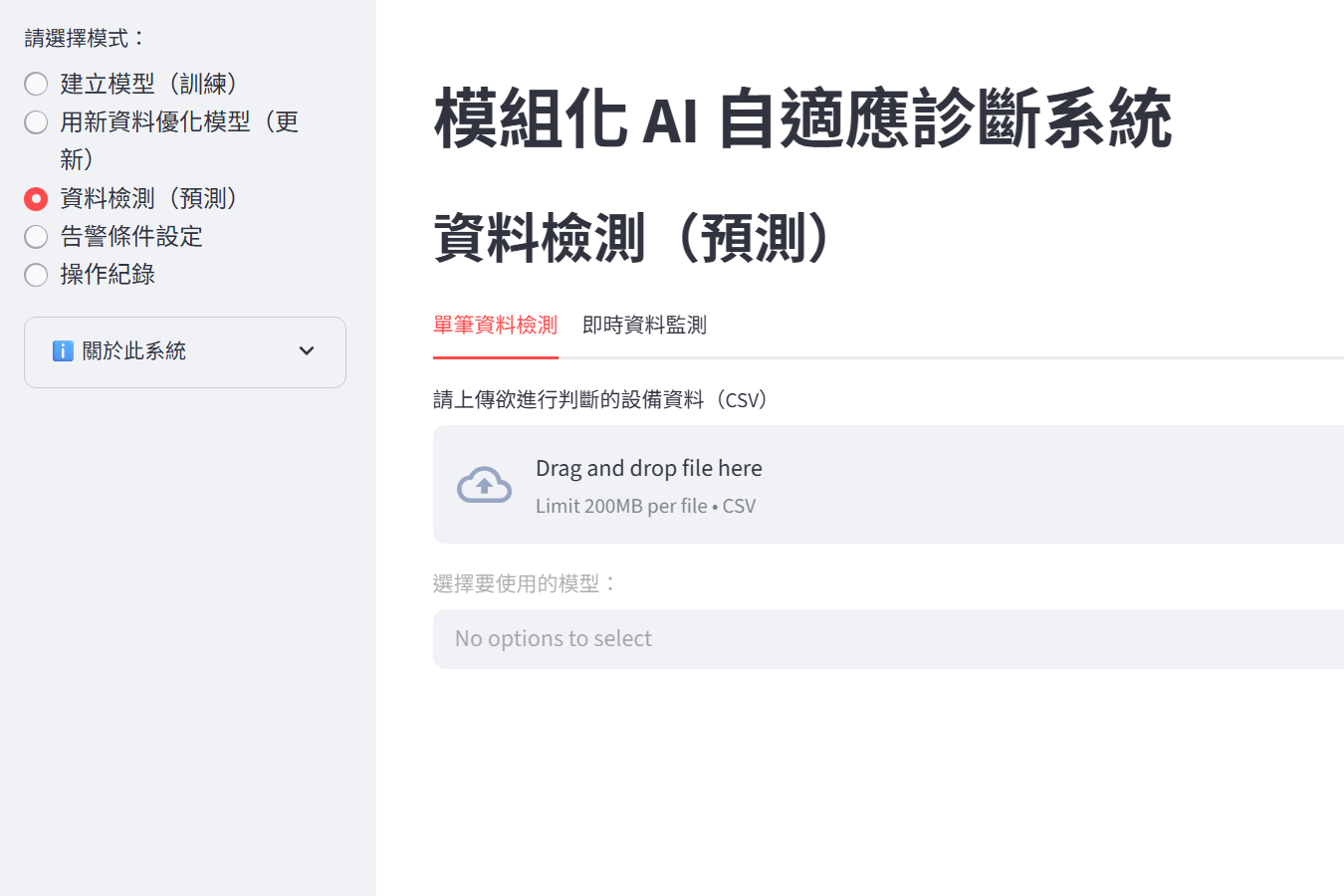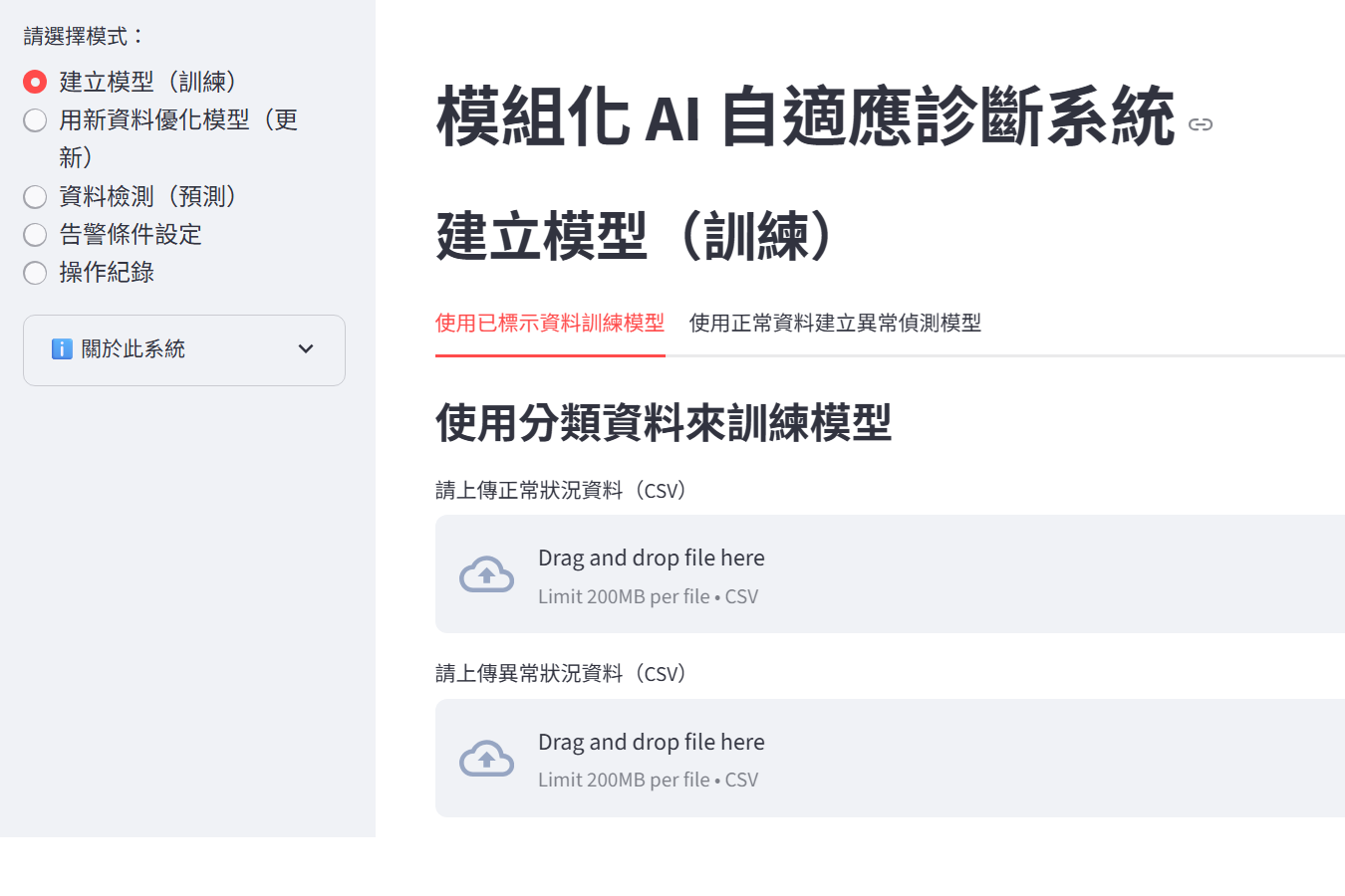本系統提供分類模型與異常偵測兩種訓練模式。使用者可上傳正常與異常資料進行模型建立,每筆檔案支援最大200MB,並可透過簡易拖曳介面完成上傳。分類模型能清楚區分不同狀況來源,有效提升製程異常辨識力,利於後續判斷與預測運算。