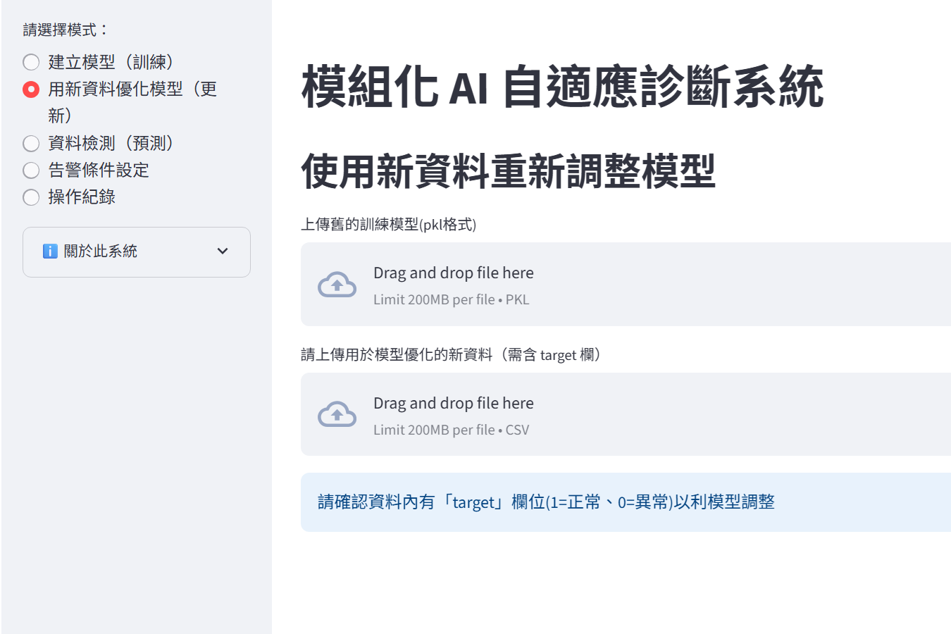 提供訓練模型(PKL)重新優化功能,使用者可透過含target欄位的新資料進行模型再訓練(retraining),目標欄標示1=正常、0=異常。此機制讓模型能隨製程變動自我調整,確保預測邏輯與時俱進,提升持續應用價值。