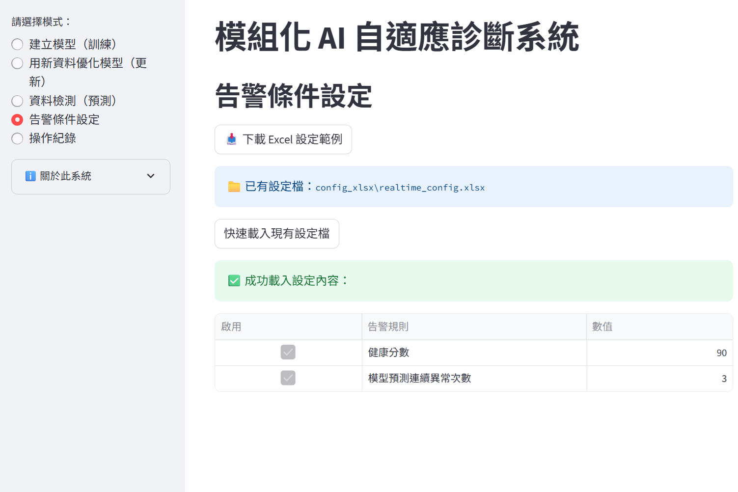 可透過Excel檔案格式匯入自定義告警條件,例如健康分數低於90、連續異常次數達3次等設定,並支援一鍵載入、快速更新機制。系統整合即時運算模組,可於達成條件時即時啟動警示,降低管控風險延遲。
