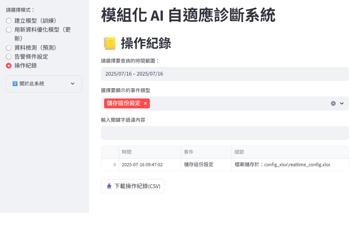 所有操作均紀錄於「操作記錄」模組中,包括設定儲存、檔案路徑與執行時間等資訊。使用者可查詢特定事件並下載記錄檔(CSV),有助於製程溯源、版本控管與內部稽核,強化系統可追蹤性與透明度。