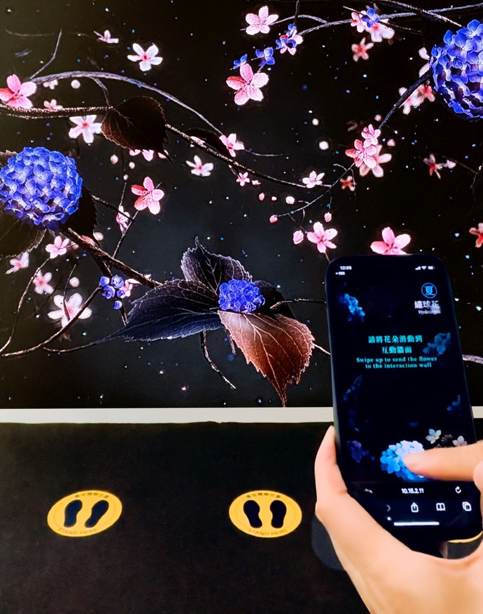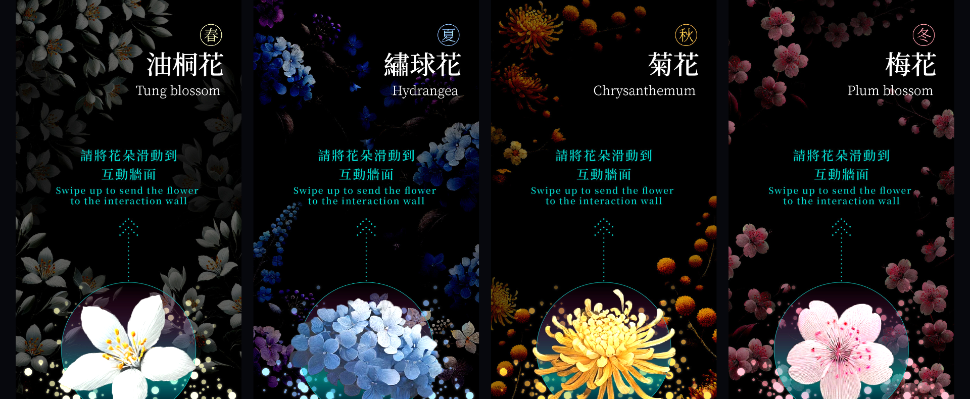 結合多人多姿態AI影像辨識與WebAR技術,讓觀眾欣賞及玩耍特殊物件(如:台灣花卉)所呈現的豐富情境;可用手機選擇特殊物件後,滑動投影至顯示螢幕上,並以手指動作操控特殊物件及特效,運用多載體裝置打造多元互動深刻體驗。