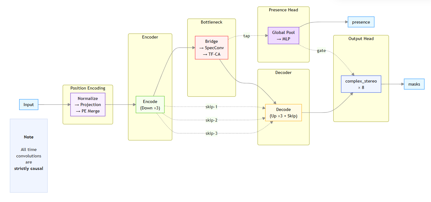 此外,模型設計支援多種遮罩模式(Mask Modes)與存在性預測頭(Presence Heads)以應對樂器缺席情況,並整合諧波位置編碼(Harmonic Frequency Positional Encoding)與可學習頻率嵌入(Learnable Frequency Embedding),以強化模型對弦樂與管樂頻譜結構的辨識能力與分離精度。整體架構在保留嚴格時間因果與低延遲特性的同時,兼顧音樂結構理解與聲音自然度,特別適用於古典音樂場景下的近即時音源分離應用。